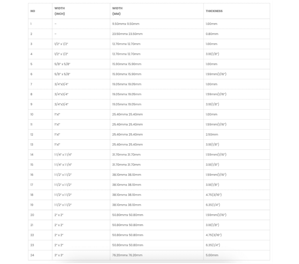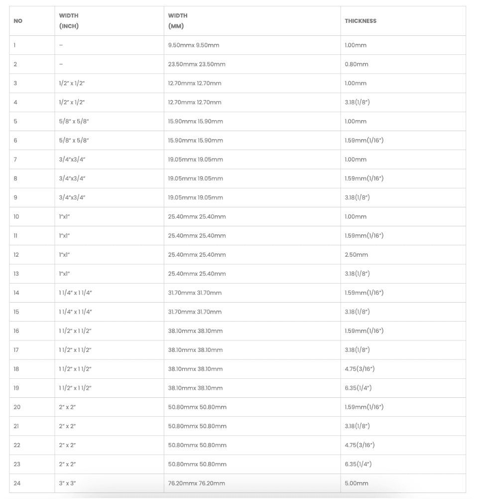 83/4”x3/4”19.05mmx 19.05mm1.59mm(1/16”)